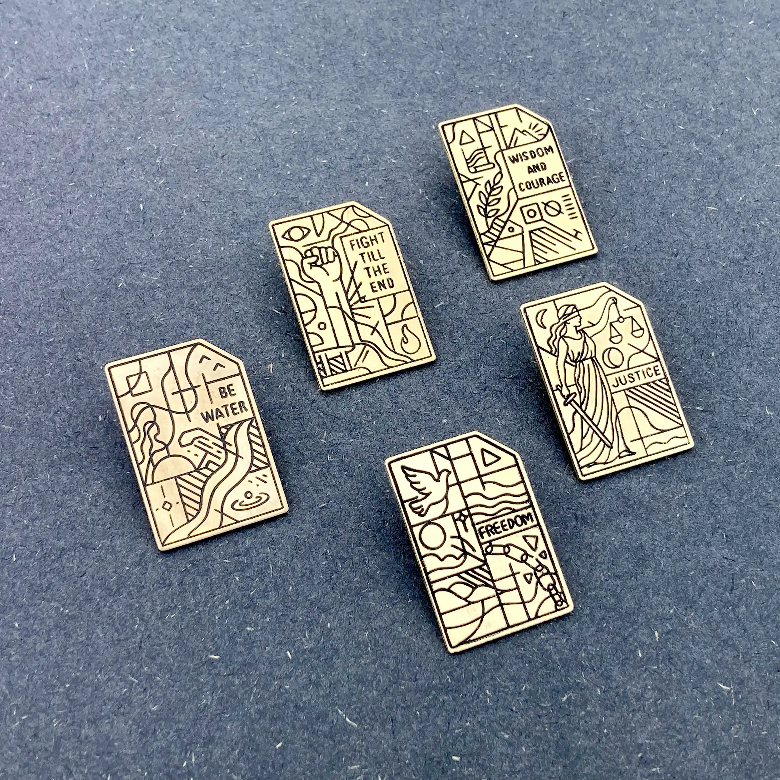 The series consists of five pieces, each representing a core theme: Justice, Freedom, Fight Till the End, Be Water, and Wisdom and Courage. These themes draw from my collective memories of Hong Kong society and serve as a personal exploration of my cultural roots. Each badge acts as a condensed emblem, preserving the persistence and emotions that emerged during turbulent times in Hong Kong.